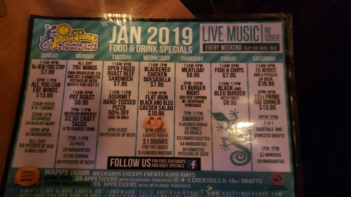 Welcome to Post Time Lounge & Cafe, a gem located along US Hwy 17 92 in Longwood, FL. This inviting spot combines a vibrant atmosphere with a menu designed to please every palate. Start your culinary journey with enticing appetizers like the crispy Chicken Tenders or the flavorful Battered Button Mushroom Caps. For those craving something heartier, the selection of sandwiches features the classic Grilled Reuben and the satisfying Mike’s Toasted White Sharp Cheddar Cheese Sandwich.